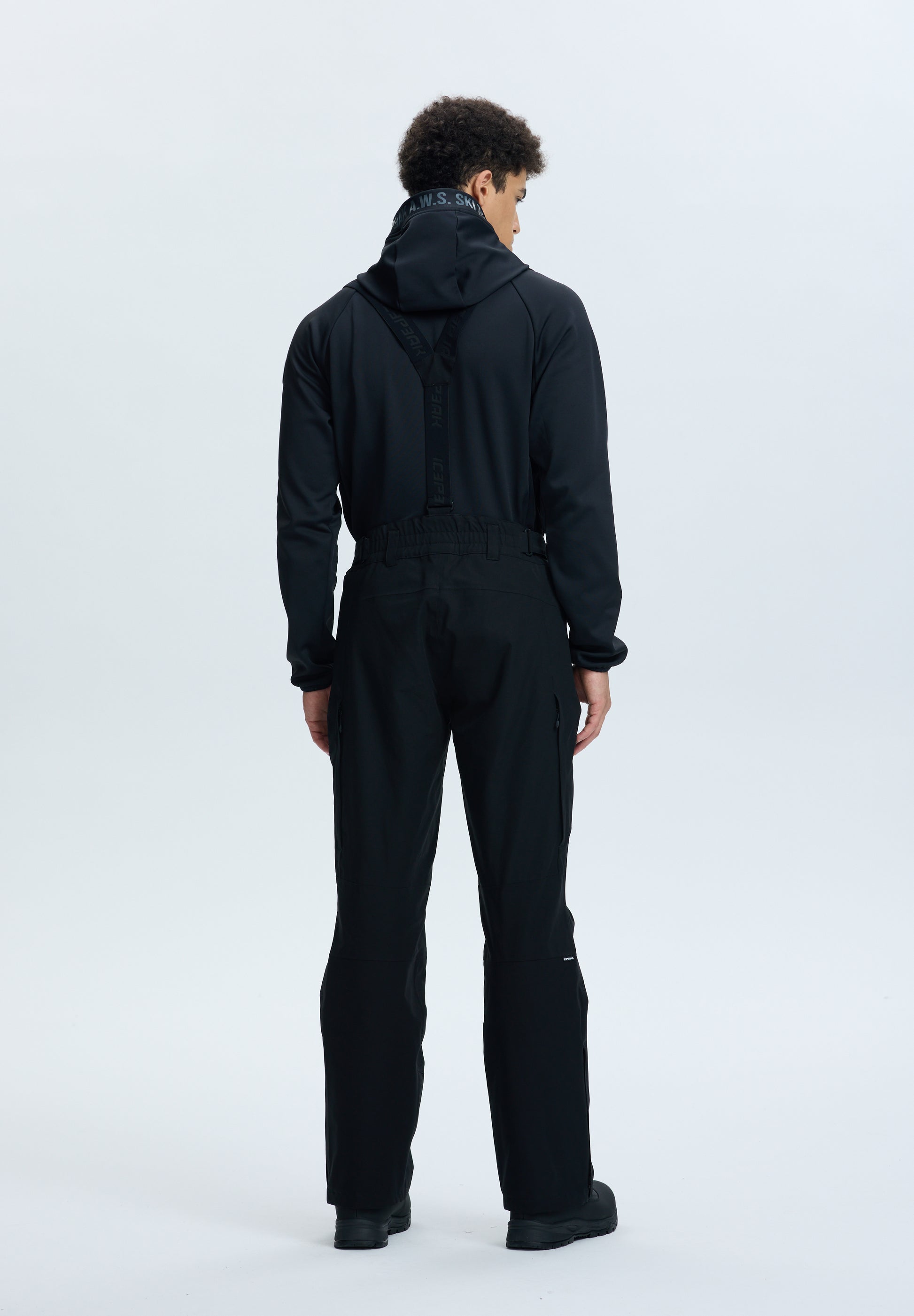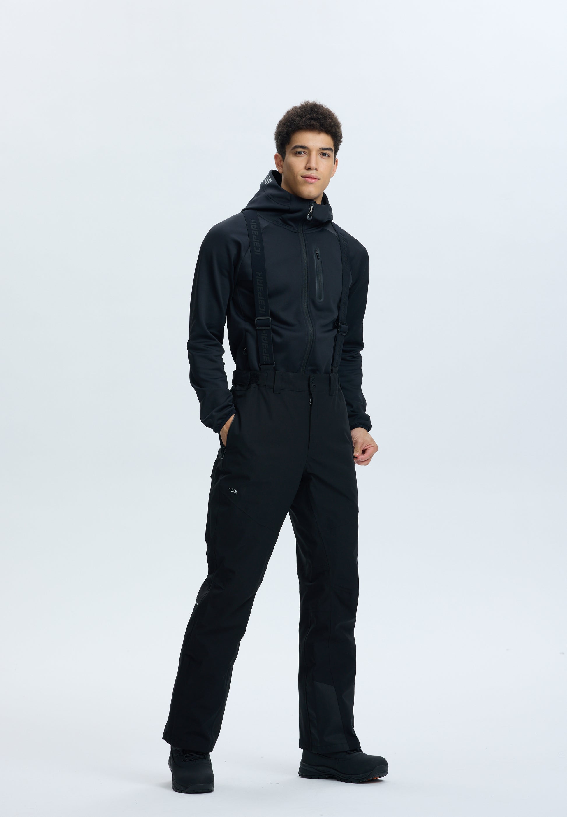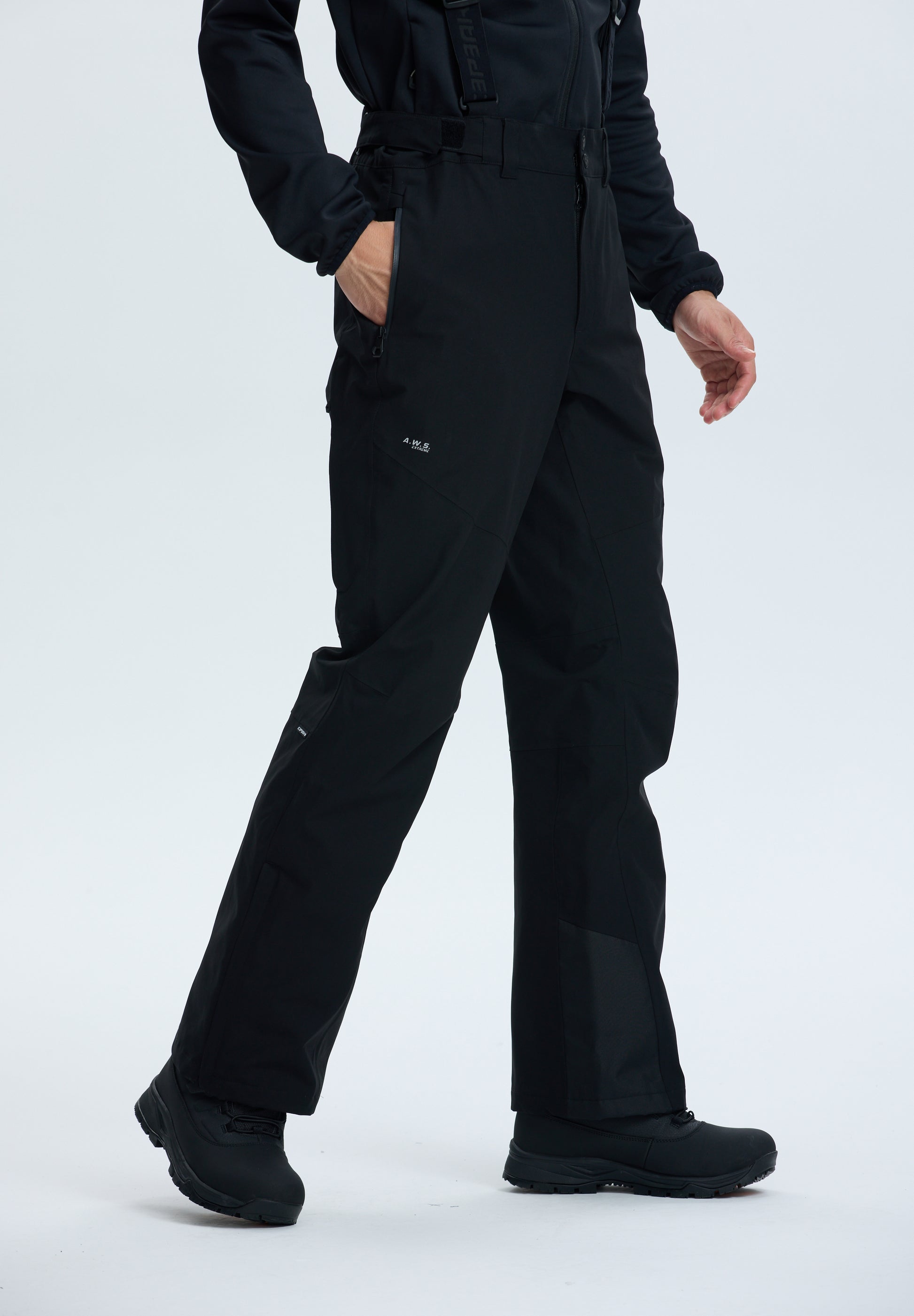Light insulation (Ski wadding: 60 g/m2) Slim fit Adjustable waist Fixed snow gaiters in the leg openings Zips at leg bottoms Two front pockets with water-repellent zips Reinforcements at leg bottoms Articulated knees Removable and adjustable braces