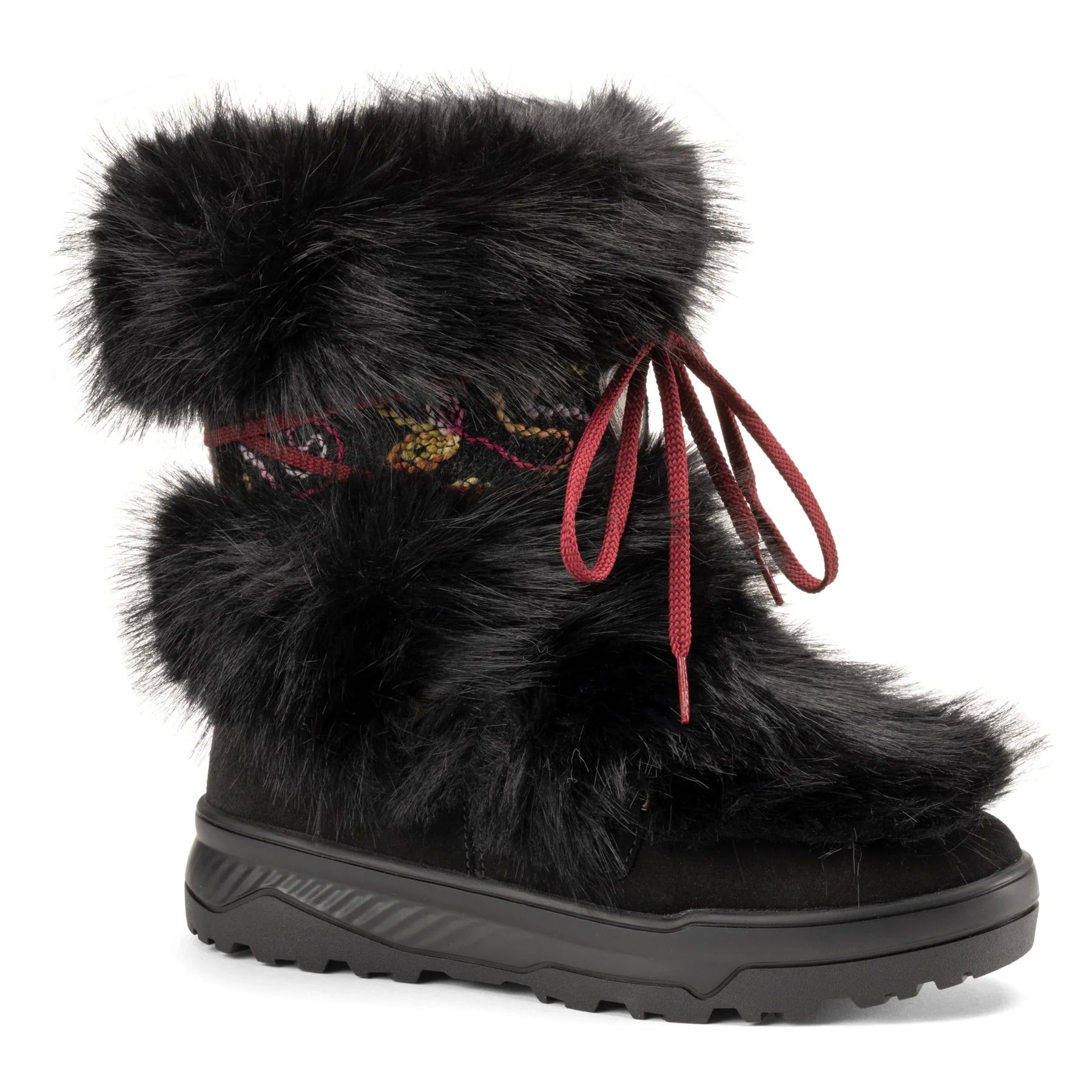 Eco faux fur upper Embroidered wool inserts with lace detail Virgin wool lining Olantex water resistant membrane Durable Anti-slip compound sole unit